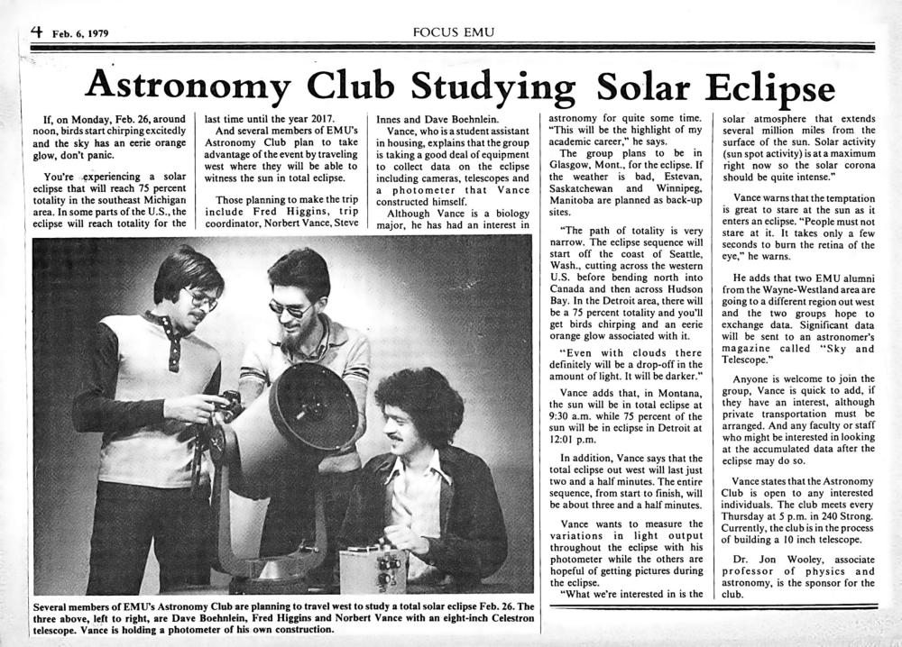 Solar eclipses can be very dramatic. The sky darkens enough to see stars. The air cools noticeably. Nocturnal animals such as bats might start appearing. And in the middle of the sky is the Sun, with a crown of glowing plasma surrounding it. Take a look at this PBS video about the 2006 solar eclipse in Libya. The good stuff starts at about 8:20 into the clip. Here is another nice video about the 1991 eclipse in Mexico. Solar eclipses require that you be in the exact path of the Moon’s shadow across the Earth. It can be very embarrassing if you set up your observing site in the wrong place. Here is NASA’s website dedicated to solar eclipses. It’s the best resource for eclipse chasers. And for those of you in North America, check out this website for all of the details about the next big eclipse to cross the United States next year.I traveled to the total solar eclipse of February 26, 1979 with seven others. Click on the play button to the right of the image of us out in the snow of Montana to see the scene and listen to the audio recording of that day. by pressing play on the audio player below. But three years ago, I recorded a most entertaining video of the August 21, 2017 eclipse from Tennessee.Take it from me, observing an eclipse definitely takes planning!The image to the right shows some college students planning their eclipse trip!